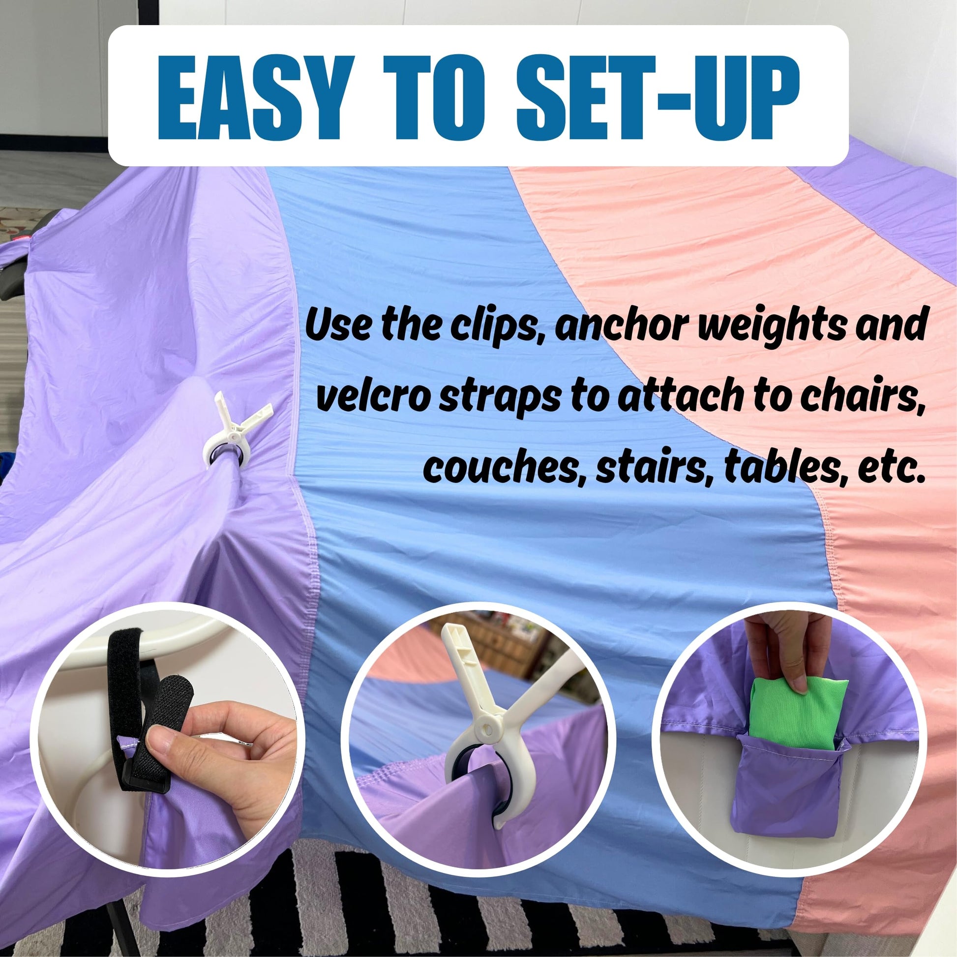 👍 Easy Setup for Endless Fun – Our fort blanket is a spacious 10 x 10 feet, eliminating the need for multiple blankets to create a fort. It comes with 4 sturdy clips, 4 anchor weights, and 4 Velcro straps, making it easy to secure to chairs, sofas, columns, or other objects. Kids can easily assemble it themselves, fostering independence and imaginative play.